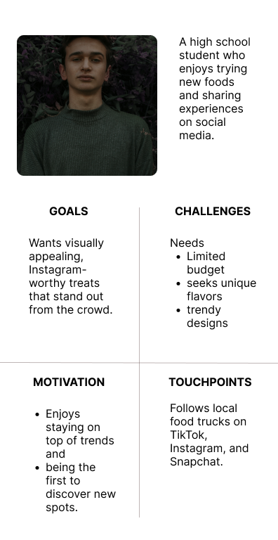 Four adult user personas were created in order to further understand the customer and business needs. One persona stands in as a parent with two kids that wants to create memories with their children while also searching for reliable and affordable products. Another persona is an event coordinator who appreciates skilled, imaginative catering that can help support their vision for events. Another persona focuses on a millennial who prefers high quality products that look aesthetic for their personal social media and the last persona focuses on a high school student who’s goals are driven by social media sharing and is searching for inexpensive, trendy sweet.