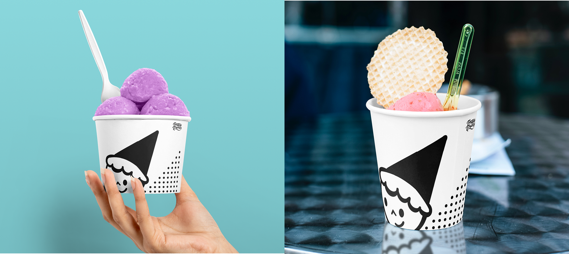 The brand's simple yet lighthearted tone was also supported by the choice of typography. Poppins was selected for body text because it is clear and readable on both print and screen, while Futura, which is used for headers and subheaders, gives a geometric voice that contrasts well with the ice cream logo. These elements worked together to create the visual design system, which was then expanded into material including prototypes of business cards, packaging of serving cups, truck design, social media design, and a website.
