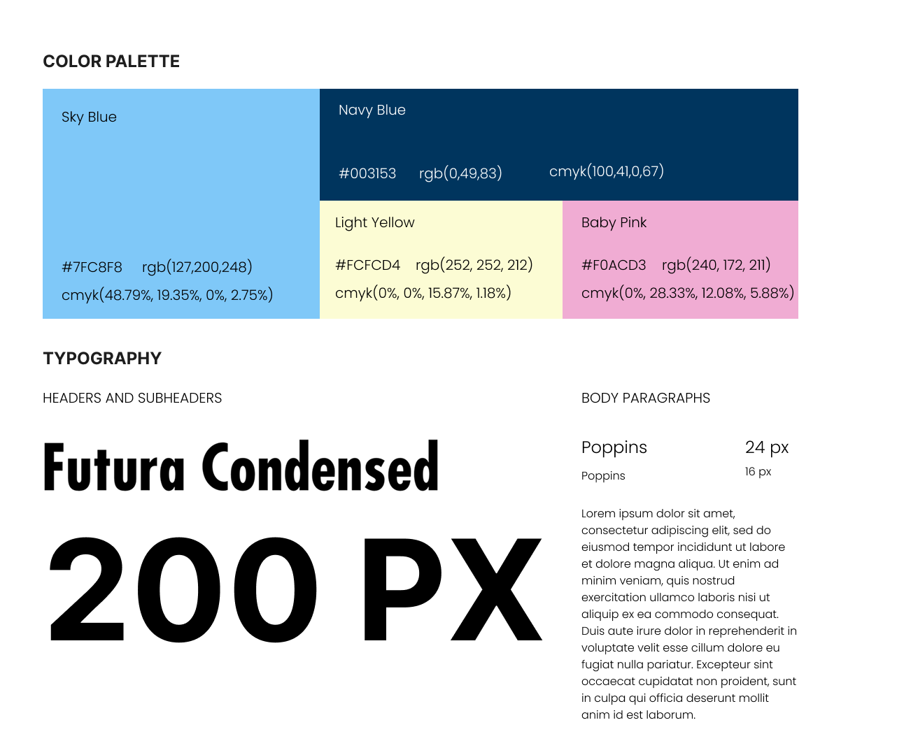 A color scheme was created to portray a cold, refreshing sensation as well as a gentle fantasy tone after the logo direction was decided. In keeping with participant preferences for pastels and vintage-inspired colors, the selected palette consists of a soft pink (#F0ACD3), a buttery cream (#FCFCD4), a deep navy for contrast (#003153), and a vivid icy blue (#7FC8F8).
